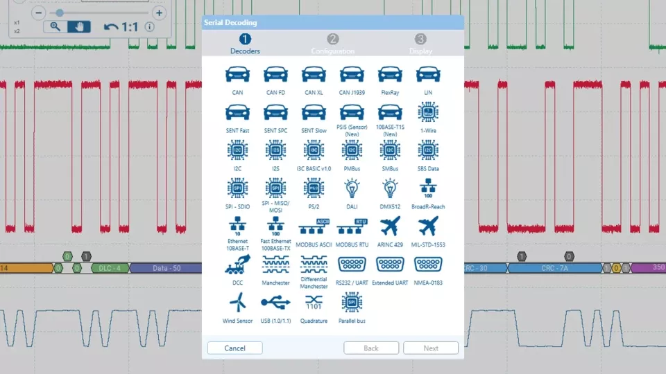 使用 PicoScope USB 示波器軟件體驗無與倫比的串行數(shù)據(jù)分析,該軟件現(xiàn)在能夠解碼 40 種不同的協(xié)議,包括 10BASE-T1S、1-Wire、I2C、SPI、UART、CAN 等(有關(guān)詳細信息,請參見圖像)。PicoScope 3000E 系列具有深存儲器和高采樣率,非常適合復(fù)雜的串行數(shù)據(jù)分析,支持同時解碼多個協(xié)議。