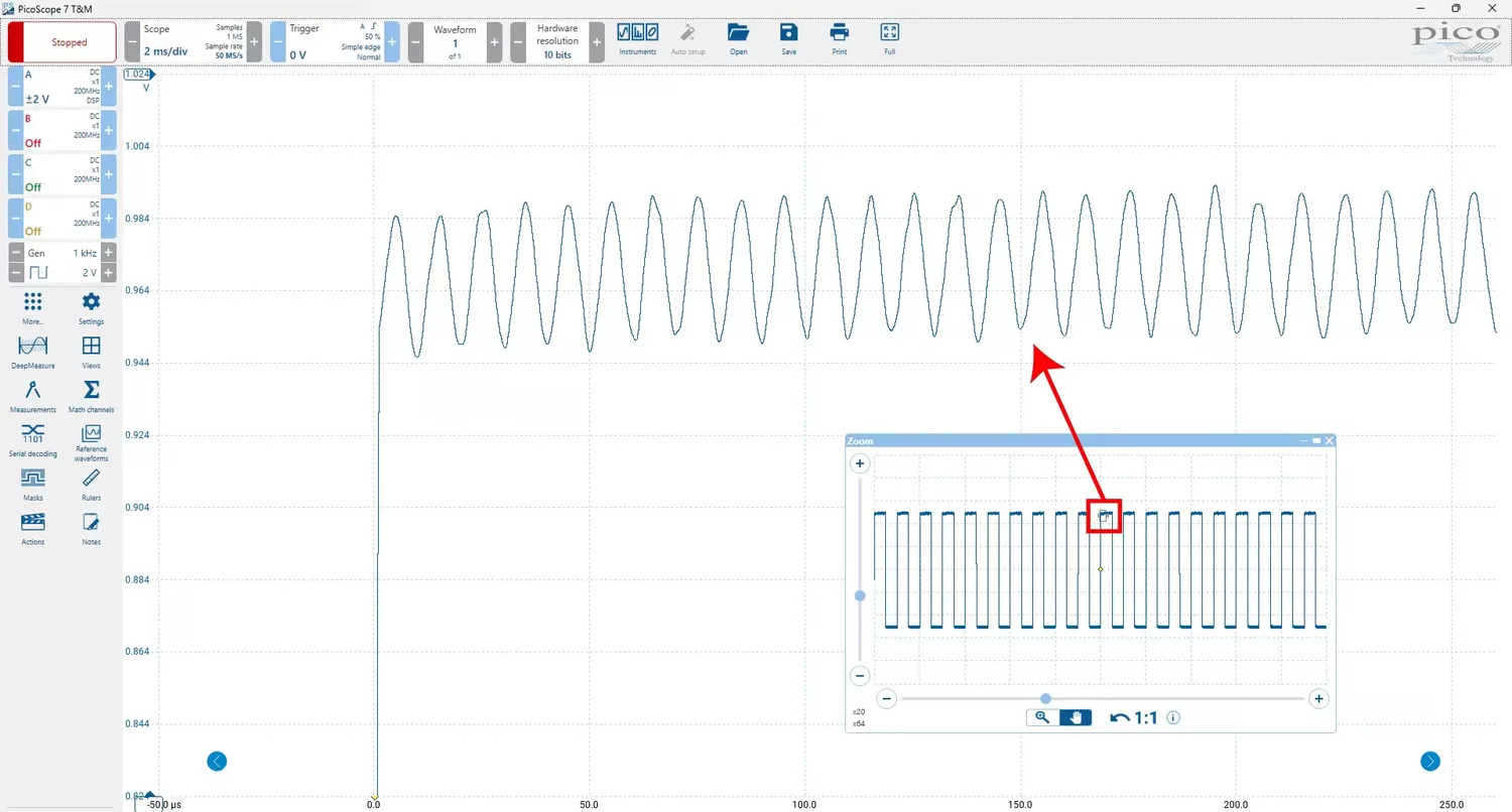 PicoScope 3000E 具有 8 至 14 位分辨率(分辨率增強)和 1 mV/div 輸入靈敏度,可以在高縮放系數(shù)下顯示低電平信號。屏幕截圖顯示了注入 1 kHz 方波的 100 kHz 正弦波,增強到 14 位分辨率后查看。盡管紋波位于其 50 倍大小的信號上,但 PicoScope 3000E 的高分辨率和深度內(nèi)存允許您放大以查看和測量每個細節(jié)。