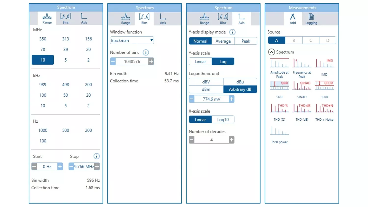 通過各種設(shè)置,您可以控制頻帶數(shù)量(FFT bin)、縮放(包括對數(shù)/對數(shù))和顯示模式(瞬時、平均或峰值保持)。選擇窗口功能允許您優(yōu)化選擇性、準(zhǔn)確性或動態(tài)范圍。