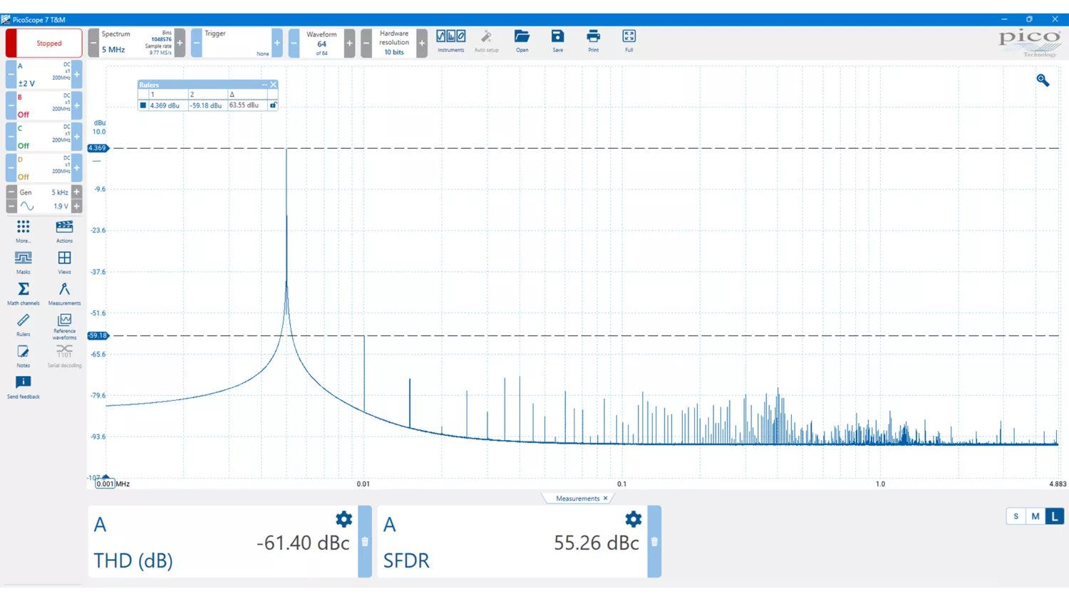 PicoScope 3000E 系列具有低噪聲、最小串?dāng)_和低諧波失真的特點。高分辨率處理可確保詳細和準(zhǔn)確的波形表示,即使在高縮放級別下也是如此。