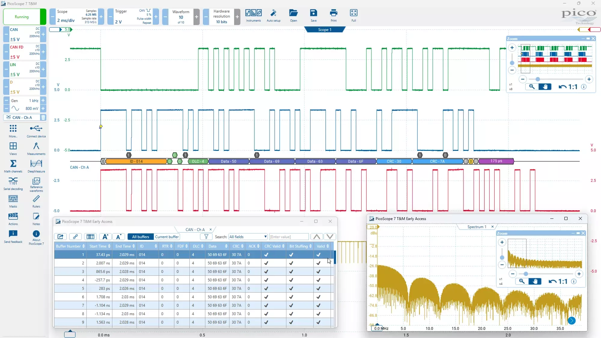 高分辨率數(shù)據(jù)可視化:在公共時間軸上以十六進制、二進制、十進制或 ASCII 格式查看波形正下方的解碼數(shù)據(jù)。錯誤幀以紅色突出顯示以便快速識別,并且可以放大以詳細調(diào)查噪聲或信號完整性問題。